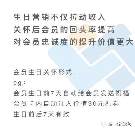 解决方案:使用微信会员系统,配置好生日赠送的礼包。比如在日当天自动赠送:礼品兑换码(进店免费兑换)、优惠券、打折卡、体验卡、余额、积分。顾客获得礼包进店兑换礼包,使用了优惠券则商家产生的业绩。
