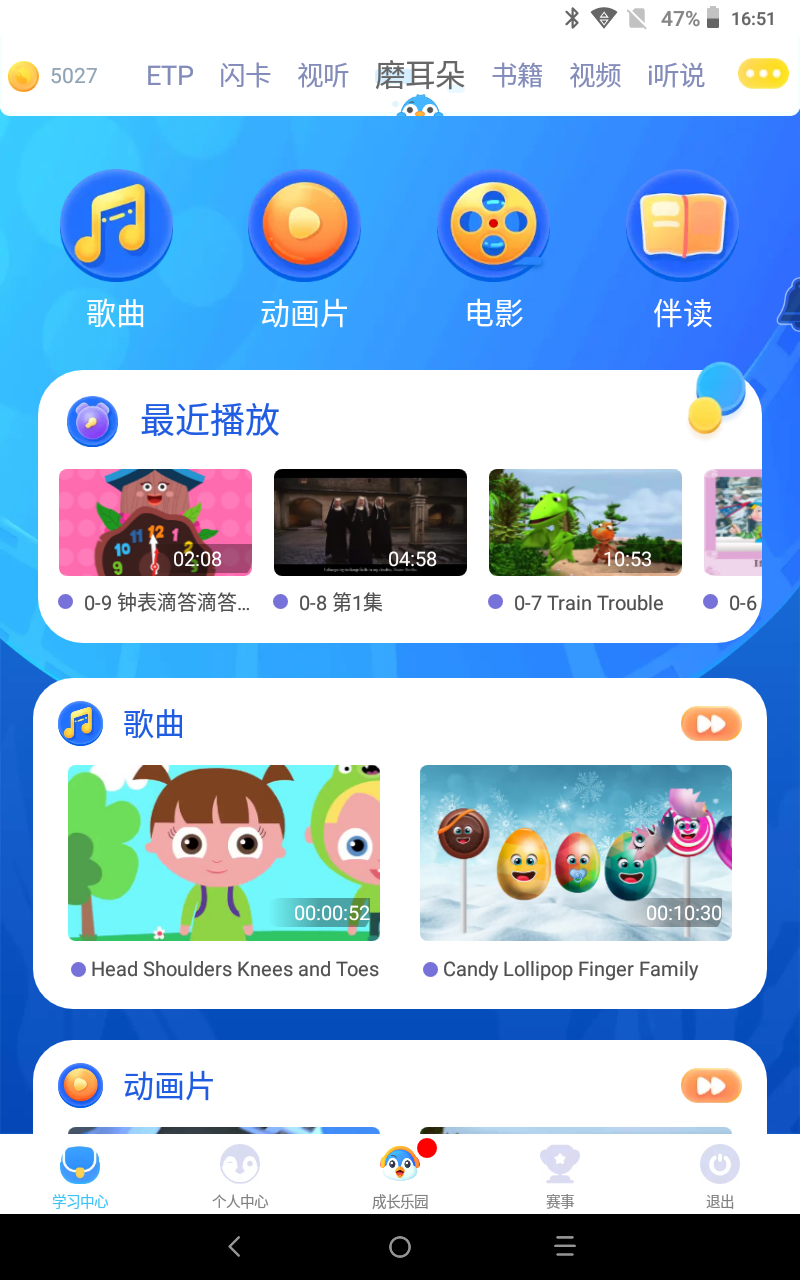 比如歌曲,「磨耳朵」将所有的歌曲素材按照难易程度划分三个等级,从一开始的简儿歌到复杂的英语歌曲,会在很大程度上帮助孩子提升口语对应的精准度和速度。