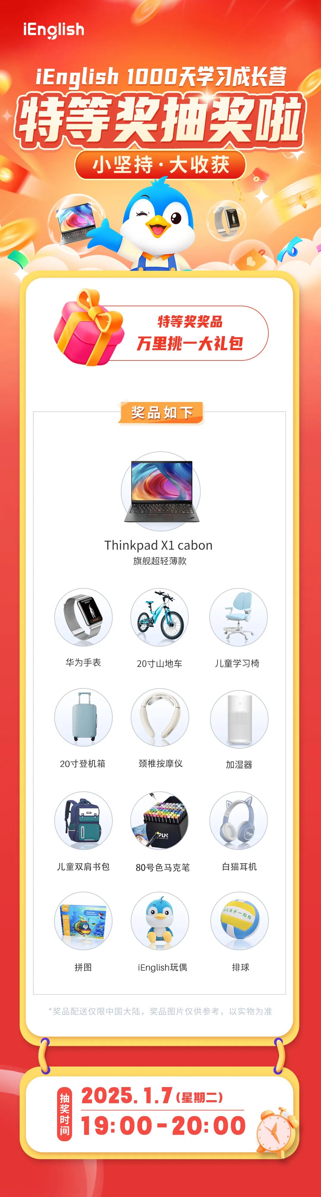 1.在2024年7月1日-12月31日成功结营,且参加过一、二、三等奖抽奖的用户,即可参与2025年1月7日(星期二)19:00—20:00iEnglish1000天学习成长营特等奖的抽取;