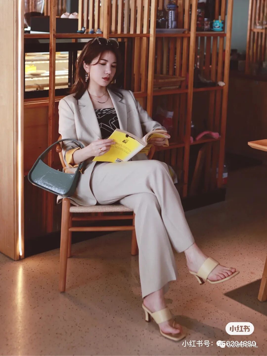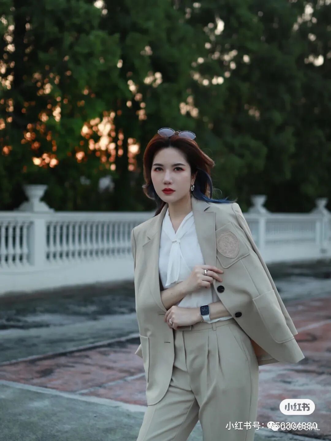 时尚博主佩仙儿一身杏色西装搭配同色系裤子,利落的线条设计,干净又简单。再戴上墨镜,散发着强大的女性气场。