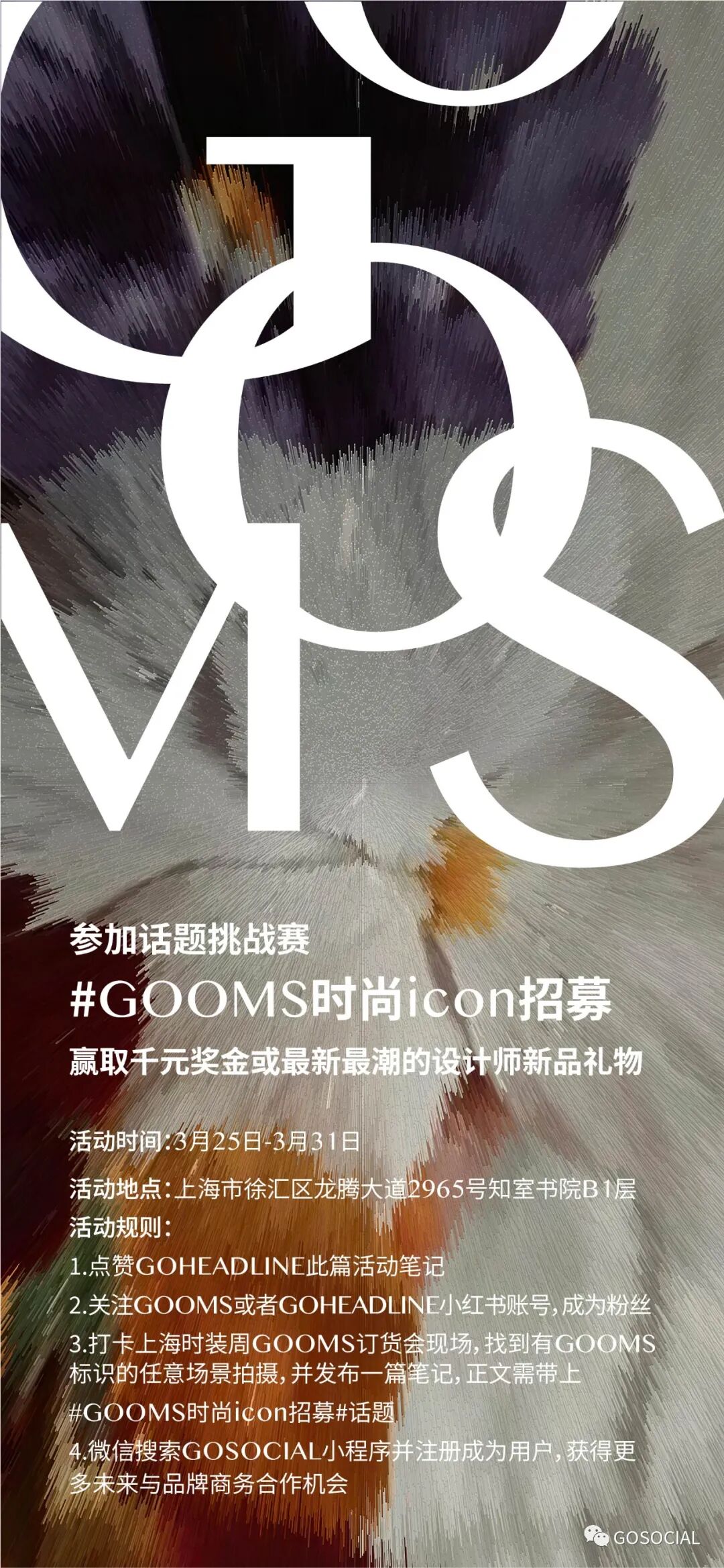 🎁参与小红书话题#GOOMS时尚icon招募 挑战赛,我们将在话题页随机抽3位幸运儿,获得千元💰及5位幸运儿获得设计师新品礼物。