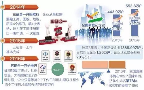 我国正式全面实施商事制度改革3周年以来,以注册资本登记制度改革为突破口,全面推进企业注册便利化。周石平介绍,再过7个月,企业注册将迎来巨大变化,可以通过互联网直接提交材料、选定名称,并且拿到手的将会是加载了工商、税务、统计、海关、商务、公安、出入境、人民银行等11个单位证(表)的“11证合一”。