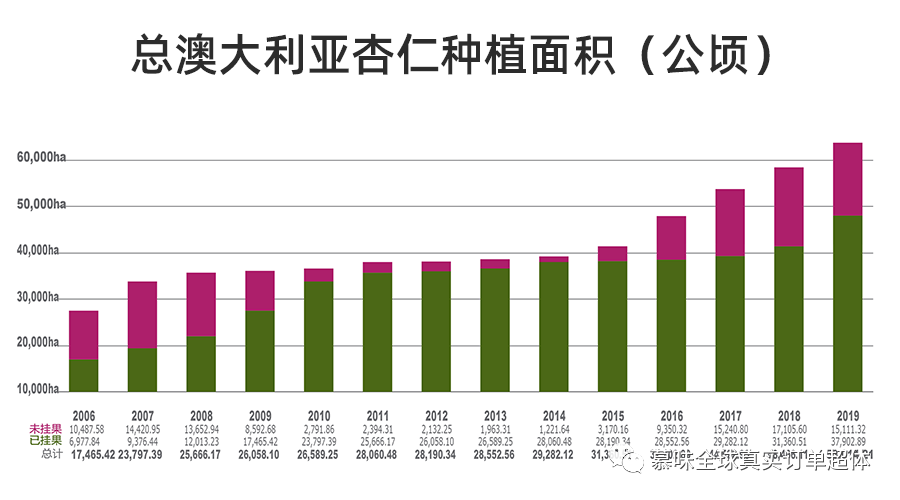 澳洲杏仁的出口量从2018/19年度的60,894吨增加到2019/20年度的76,556吨。澳洲对中国的杏仁出口量从2018/19年度澳洲总出口量的20%增加到2019/20年度的52%。在2019/20年度澳大利亚杏仁产业继续扩大,冬季种植又增加了4548公顷,总面积达到53014公顷,据澳洲杏仁委员会预计2019/20年度产量有望达到160,000吨。