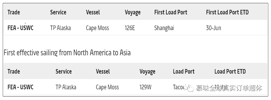 新TP Alaska航线:上海(中国)—盐田(中国)—塔科马(美国)—荷兰港(美国)*—横滨(日本)*—釜山(韩国)*—青岛(中国)*—上海(中国)—盐田(中国) – 塔科马(美国)。