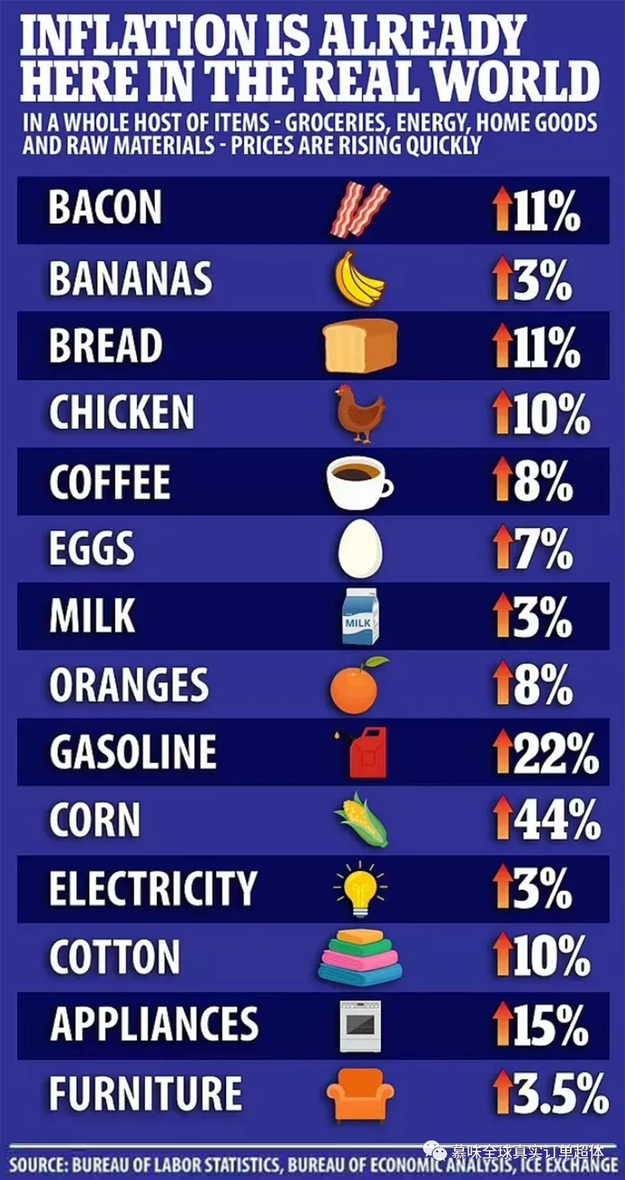 根据美国记者的调查,目前美国各大超市的日常生活物资集体涨价,其中:培根涨价11%,香蕉涨价3%,面包涨价11%,鸡肉涨价10%,咖啡涨价8%,鸡蛋涨价7%,牛奶涨价3%,橙子涨价8%,汽油涨价22%,玉米涨价44%,家用电器涨价约15%。而美国5月份的房租数据,同比增长达5.4%。这些涨价都是集中在短短一两个月内发生的,美国普通群众对此感知非常明显。目前美国网站上最流行的评论是,什么都涨,就是工资不涨。