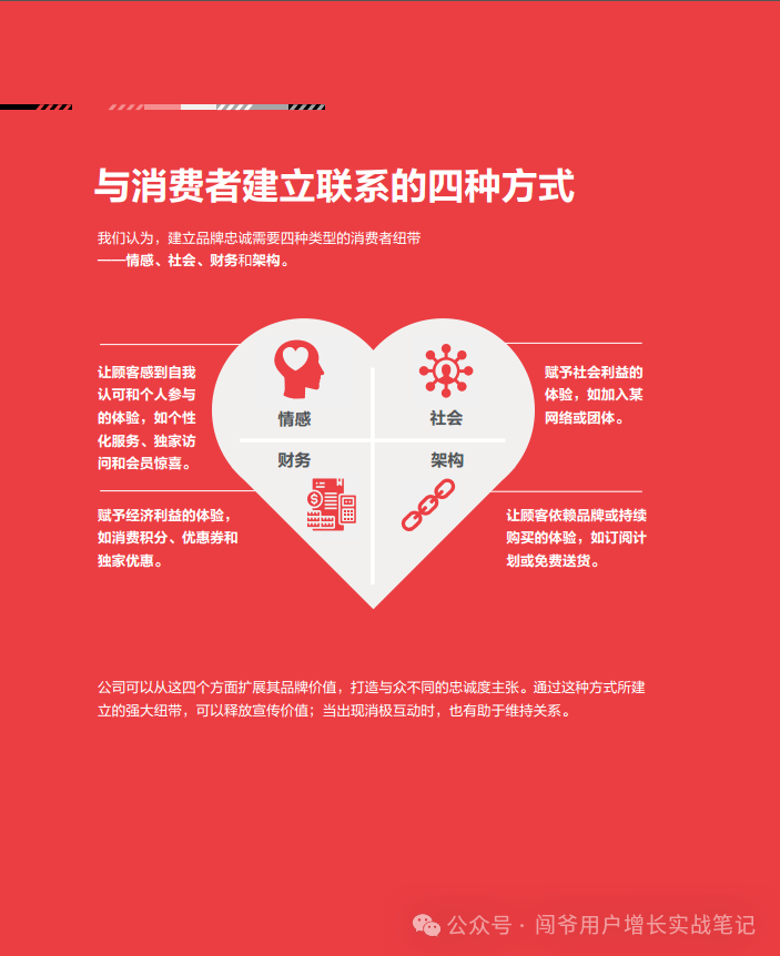 5. 构建消费者关系的四维策略:品牌需要在情感、社交、财务和结构四个层面上与消费者建立牢固的联系,以此提升品牌价值和深化顾客忠诚。