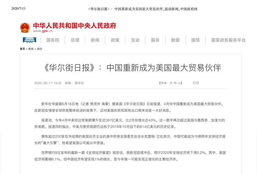 6月14日,美国《华尔街日报》在一篇题为《中国是美国暗淡贸易前景中的亮点》的文章里写道:今年4月份,美中贸易额增加至397亿美元,环比增长了43%,再次超过美国与墨西哥和加拿大的贸易额。在新冠疫情限制全球贸易之际,中国重新取得美国最大贸易伙伴的地位,对美国农民和其他出口商而言是少有的亮点。