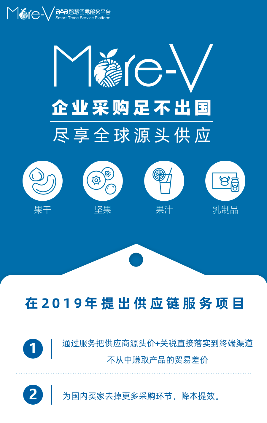 More-V作为供应链服务商,以21年深耕进口食品贸易的经验,深化果干、坚果、果汁及乳制品国际采购服务,在2019年提出的供应链服务项目基础上,又增加了新内容。其核心是通过服务把供应商源头价+关税直接落实到终端渠道,不从中赚取产品的贸易差价,为国内买家去掉更多采购环节,降本提效。