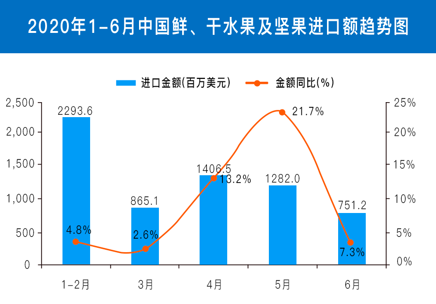 据中商产业研究院数据库显示,2020年6月中国鲜、干果及坚果进口量下降。2020年6月中国鲜、干果及坚果进口量为48.2万吨,同比下降12.1%;从金额方面来看,由于价格上涨2020年6月中国鲜、干果及坚果进口金额为751.2百万美元,同比增长7.3%。
