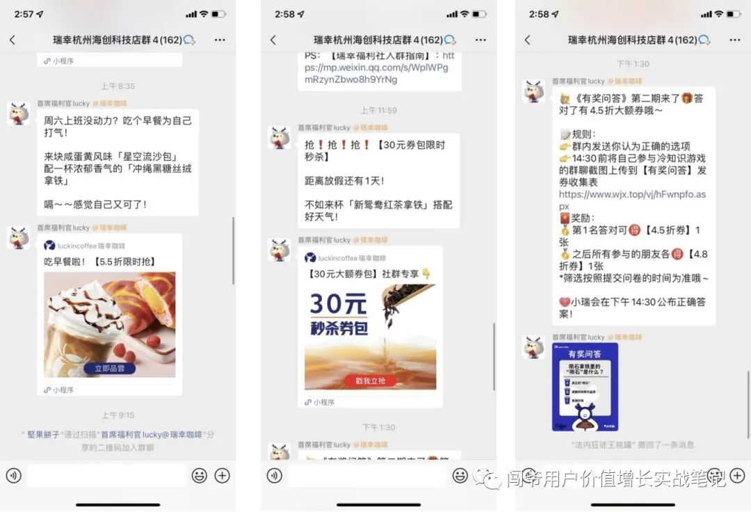 (2)社群定位为老用户留存和提频,更好触达用户,提高消费频次。社群主要发福利,每天会有4次活动。