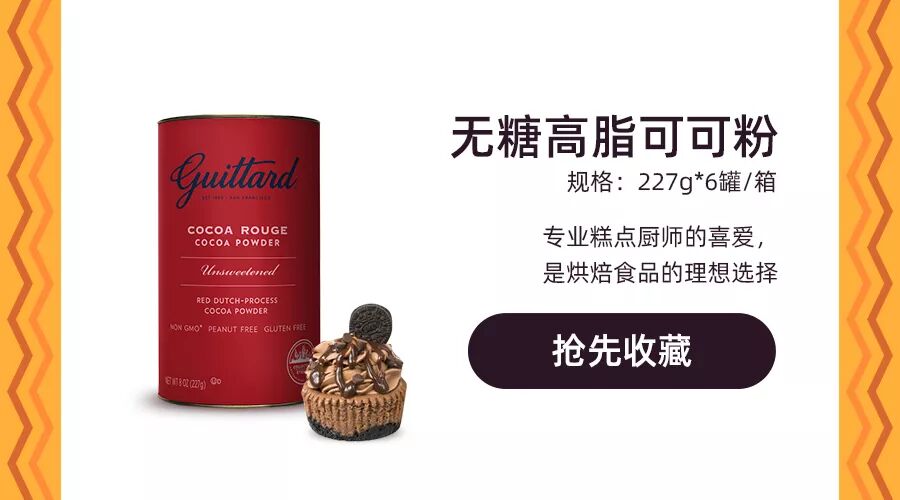 Guittard可可粉无花生和麸质,拥有全天然的香草味,深受专业糕点厨师的喜爱。它具有浓郁的苦甜特色,丰富的深红色、强烈的软糖味和全巧克力精华,是烘焙食品(如蛋糕和糕点)的理想选择,其浓郁而微妙的可可风味为其他食材提供了美味的补充。