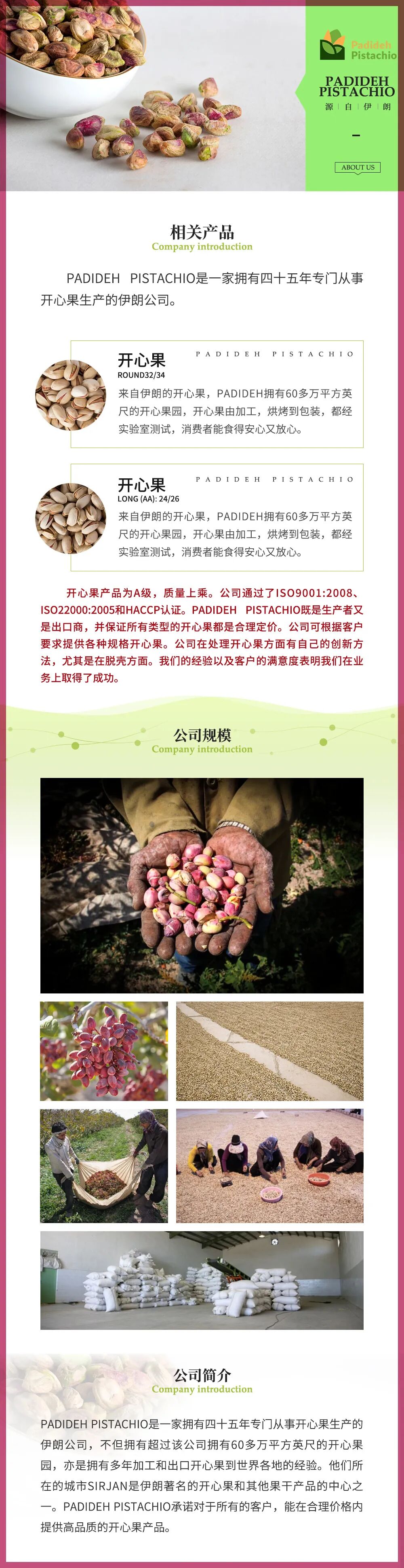 Padideh pistachio是一家拥有四十五年专门从事开心果生产的伊朗公司,不但拥有超过60多万平方英尺的开心果园,而且拥有多年加工和出口开心果到世界各地的经验。他们所在的城市Sirjan是伊朗著名的开心果和其他果干产品的中心之一,对于所有的客户,Padideh Pistachio承诺能在合理价格内提供高品质的开心果产品。