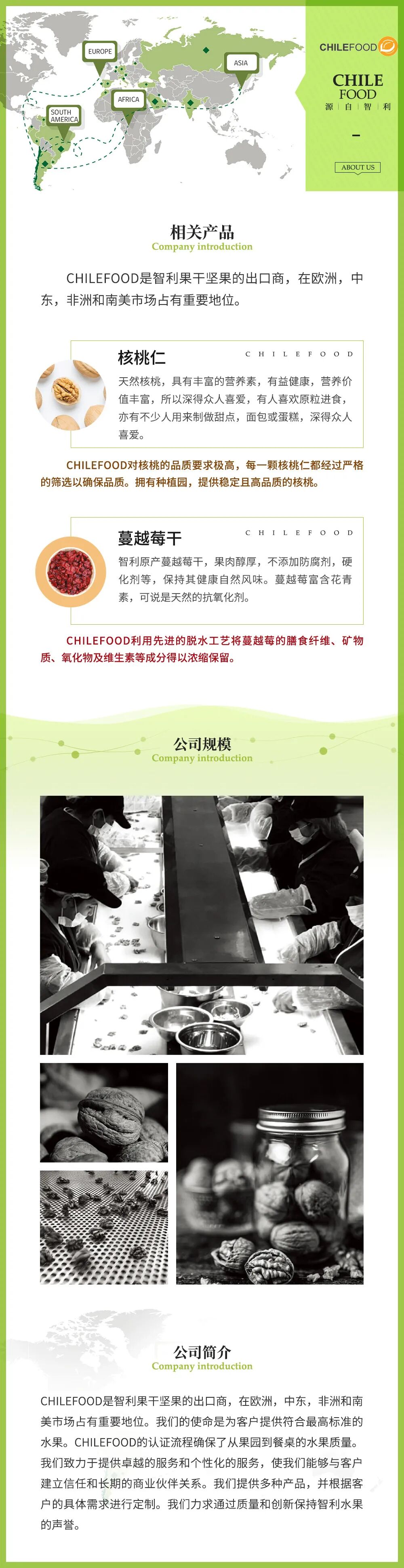 CHILEFOOD是智利果干坚果的出口商,在欧洲、中东、非洲和南美市场占有重要地位,他们的使命是为客户提供符合最高标准的水果。Chilefood的认证流程确保了从果园到餐桌的水果质量,所提供的卓越服务和个性化服务,使他们能够与客户建立信任和长期的商业伙伴关系。他们提供多种产品,并根据客户的具体需求进行定制,力求通过质量和创新保持智利水果的声誉。