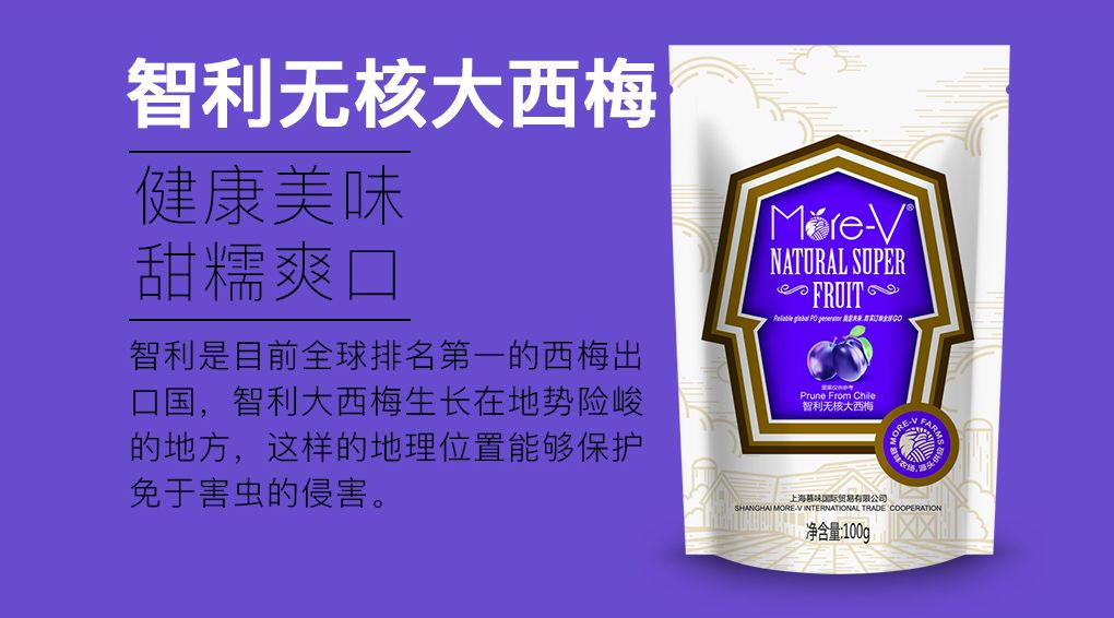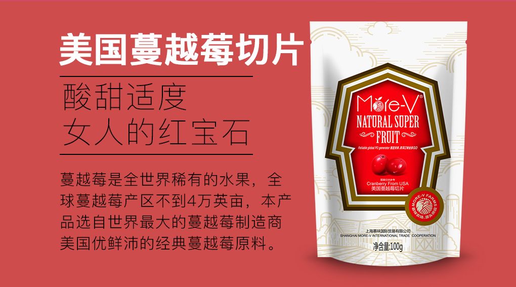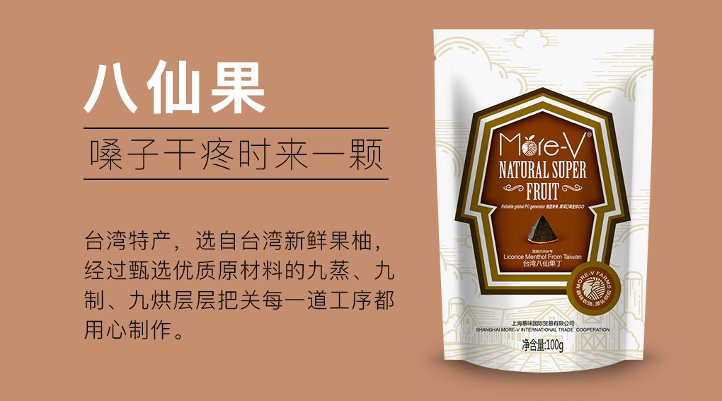 More-V拥有在中国合法制作以“宗旨英文”作为视觉刺激的小包装欧美潮牌风格商品,所拥有的价值1200万美金的More-V Natural Super Fruit(更具价值的天然超级产物)全方位专利,使More-V Natural Super Fruit字母组合可以在中国作为极具标志性的包装设计。