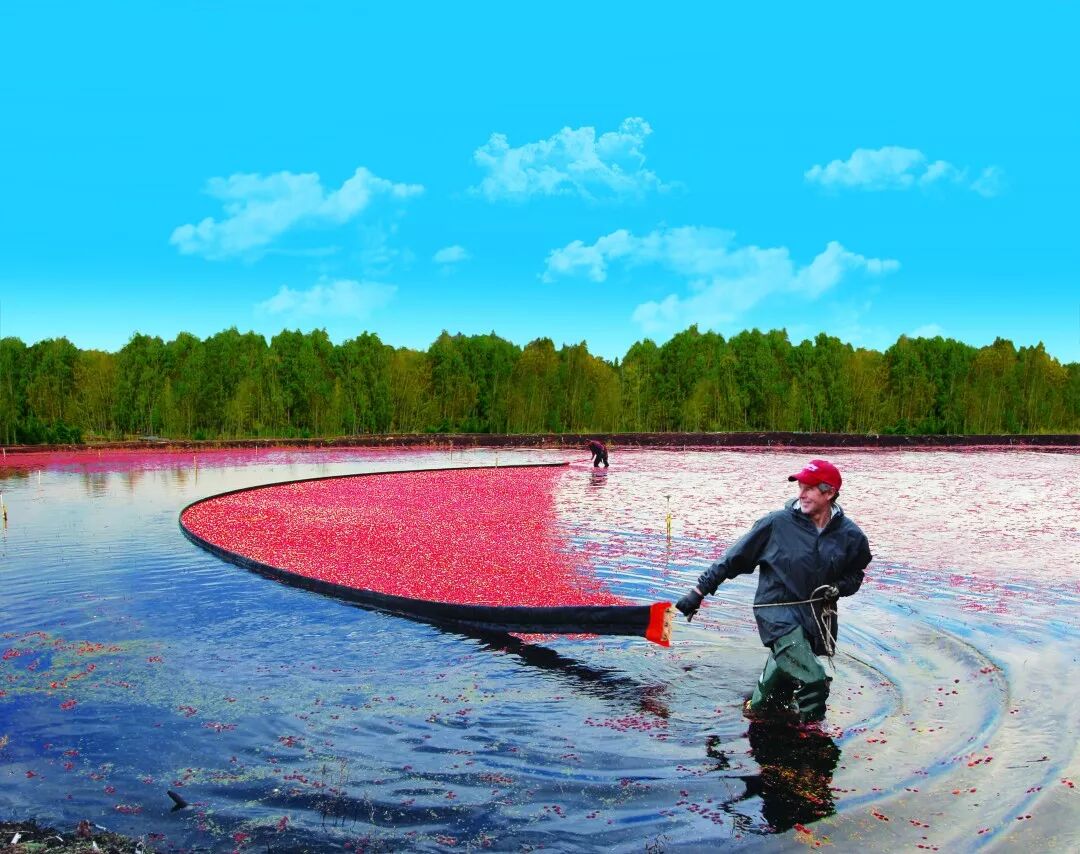 蔓越莓栽培需要仔细控制供水量:一方面是为了保证充足的水分灌溉,另一方面也是为用“水收法”采收果子做好准备。每年春天播种,而收获季节从10月份开始直至11月,根据不同时节果实的成熟情况会有所变化。优质的蔓越莓果内含空气,密度较小,往往能够漂浮在水面上。采收伊始,果农们会将蔓越莓田注满水,然后开着水车巡回田间打水,待脱落的蔓越莓果浮出水面,再用栏木圈集筛选。水车、红果、波光与蓝天交织成壮美的画面,使人叹为观止。因此,金秋之际观看或体验蔓越莓采收和欣赏三文鱼回流的盛景、造访落基山脉和冰原一样,已经成为了如今来加拿大游玩的游客们的必备项目。