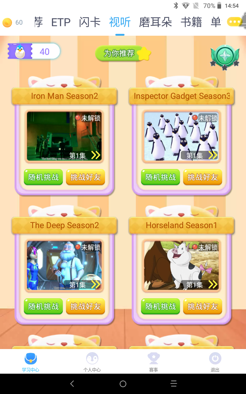 iEnglish的智能推荐系统,根据孩子的学习进度和兴趣,个性化推荐学习内容,科学调配各板块学习时长,确保每个孩子都能找到适合自己的学习路径,让孩子爱上英语,提高学习效率。