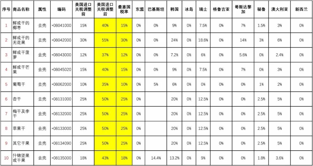 果干类产品,无花果、杏干、梅干等关税美国已加至50%,与最惠国税率相比,这无疑增加了几倍的关税率,但东盟、格鲁吉亚、新西兰的关税依旧为0%。