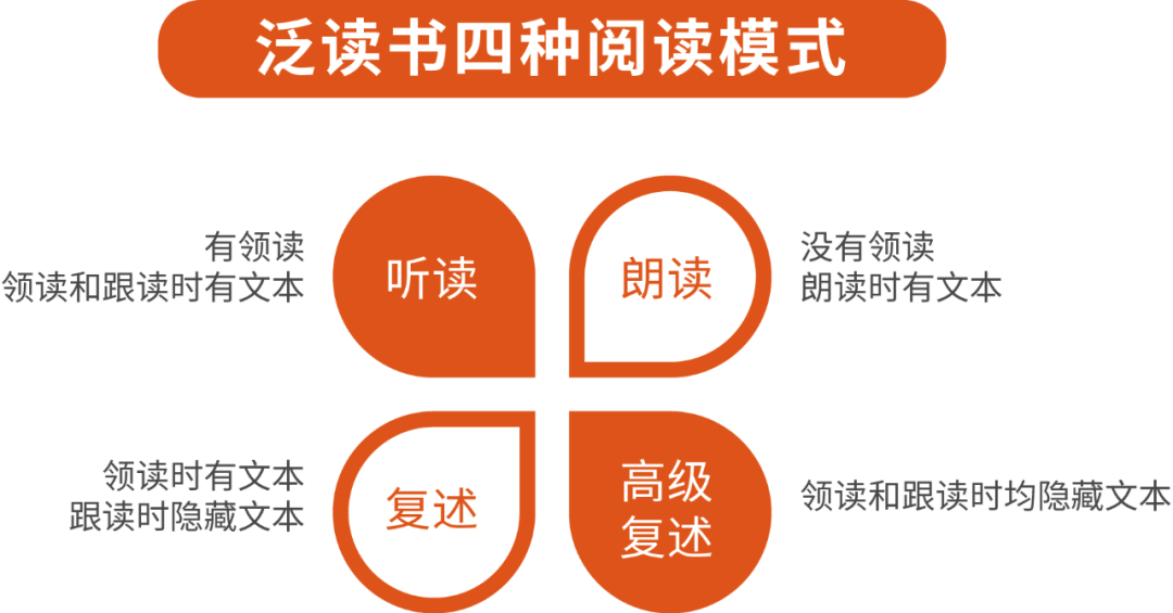 在同一等级下,孩子可以使用到多种阅读模式,包括听读、朗读、复述、高级复述。