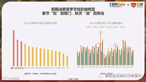 与小周末比,大假期的餐饮消费,受季节性影响明显。整体来看,与节日所在的季节较为相关。比如厦门,节日消费主要集中在春节,与温暖的海岛氛围息息相关,而青岛则很明显在国庆和中秋获得了更多的假日消费,主要是因为人们往往喜欢在秋高气爽的季节去海滨城市旅游。