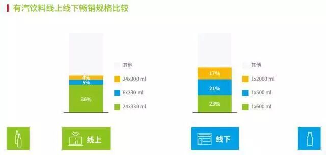 为线上与线下渠道设计出不同的包装规格,细微的促销战略,可以带动整体销量的增长。根据尼尔森的线上零售监测数据,同一个品牌的有汽饮料在线上以24瓶330ml(36%)售卖时,销量竟远高于6瓶330ml(5%)或24瓶300ml的组合(4%)。