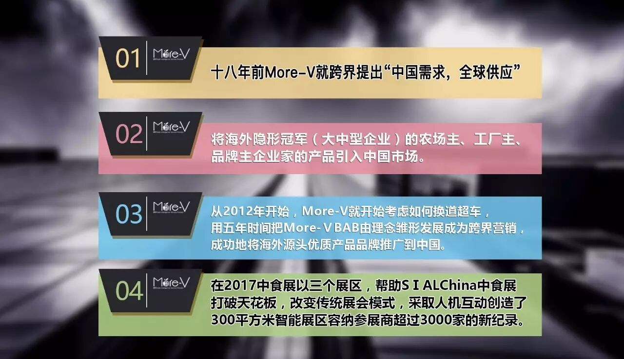 从2012年开始,More-V就开始考虑如何换道超车,用了五年的时间才把More-V BAB由理念雏形发展成为跨界营销,成功地将海外源头优质产品品牌推广到中国。并且与时代同步,在2017中食展以三个展区,帮助SIAL China中食展打破天花板,改变传统展会模式,采取人机互动创造了300平方米智能展区容纳参展商超过3000家的新记录,取得了收益指数性增长的效果。