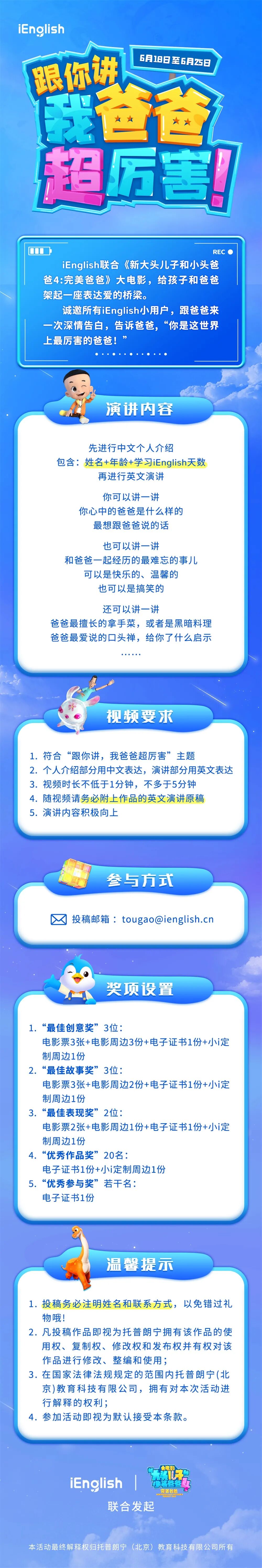 iEnglish联合大头儿子,向iEnglish小用户发起“跟你讲,我爸爸超厉害!”——iEnglish我和爸爸的故事英文演讲征集活动,一起给爸爸献上父亲节的祝福!