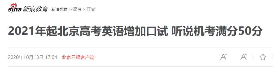 据北京考试报10月13日消息,根据北京市深化高等教育学校考试招生制度综合改革实施方案,从2021年起,高考英语增加口语考试,口语+听力考试共计50分。