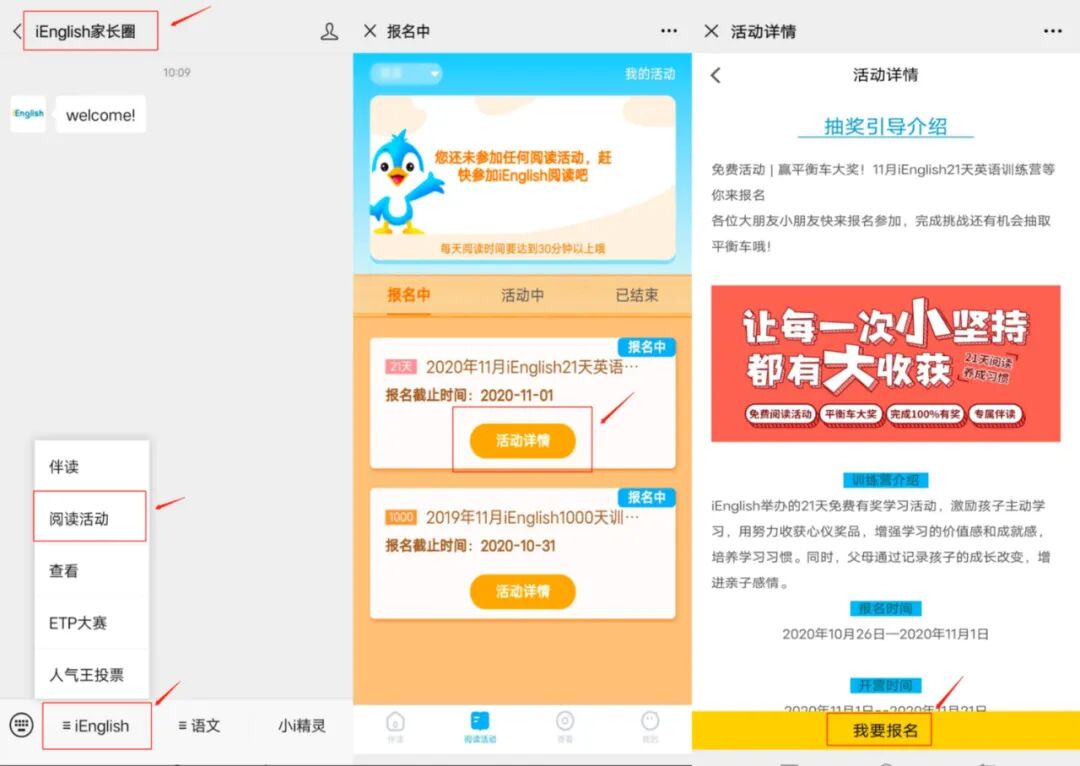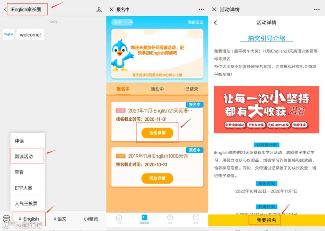 报名需先关注“iEnglish家长圈”微信公众号,绑定孩子的iEnglish账号。