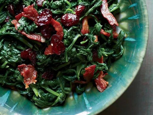 用酸甜的蔓越莓和脆皮培根打扮这个菜。清炒菠菜是一道很普通的中国菜,几乎所有的餐厅都有,但是和蔓越莓一起炒的微乎其微,蔓越莓的酸甜口味把菠菜的涩味完美地遮盖了,但又保留了菠菜的香味,再加上培根的点缀,这道红配绿的经典搭配为菠菜平添了不少风味。