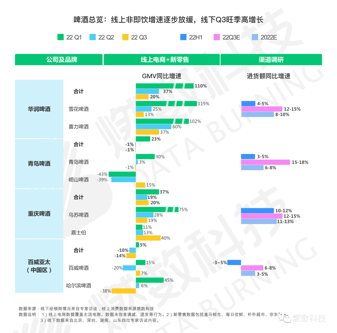 百威亚太表现较好,22Q2和22Q3销量均呈同比上升,带动GMV同比增速有所上升,22Q3市占率亦较22Q2上升1pct。