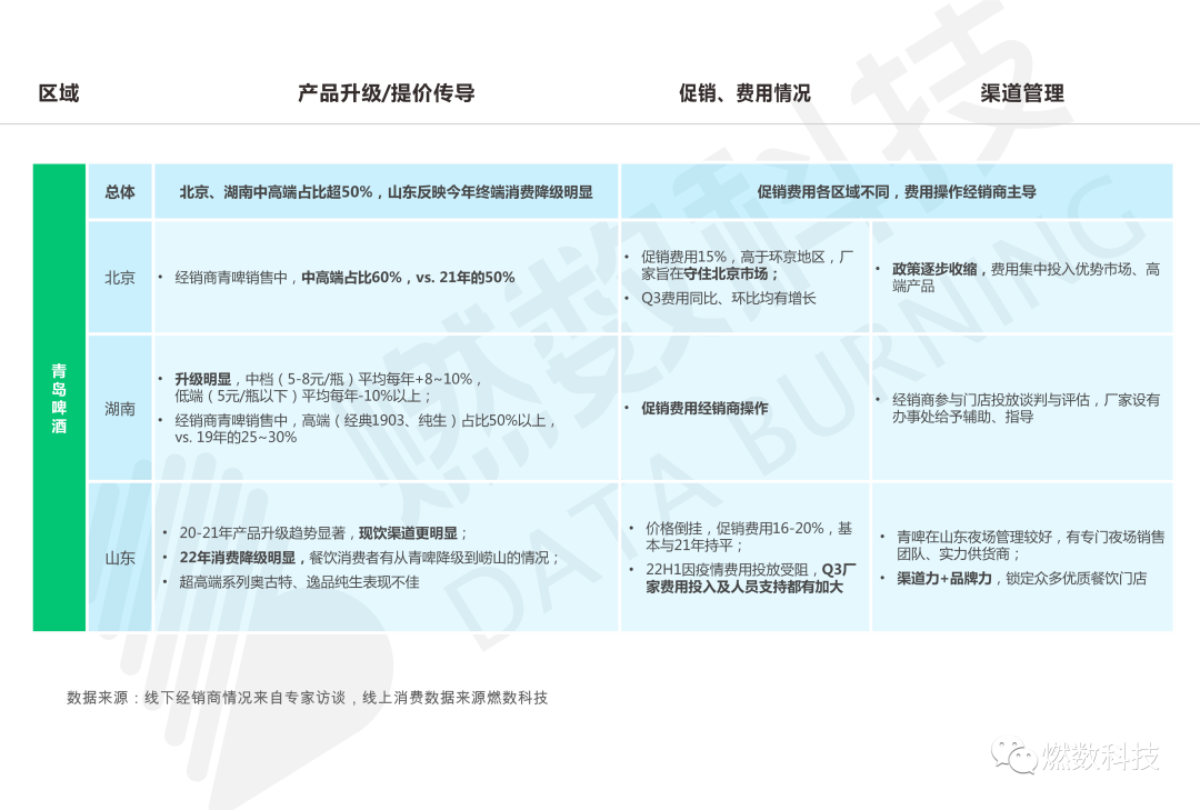 线下渠道看(北京、湖南、山东),华润渠道力优势明显,助力喜力品牌终端动销,预计22年全年喜力增速20%+(Q3 20%+),雪花品牌各地区均有厂家压货,预计全年增速冲刺10%+(Q3 13%+);结构升级方面,一方面一线城市整体产品提价更为顺畅,另一方面Super X替代升级勇闯天涯、经典老雪替代传统雪花的结构升级持续推进;促销费用投放近两年整体保持相对稳定,利润率有提升空间。