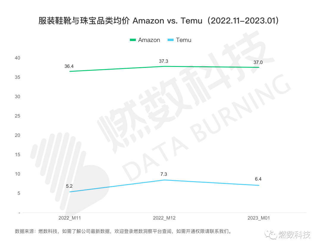Amazon平台纺服珠宝均价约为Temu平台的6倍:从2022年11月至2023年1月,Temu平台纺服珠宝的均价~6美元,而Amazon平台~37美元。