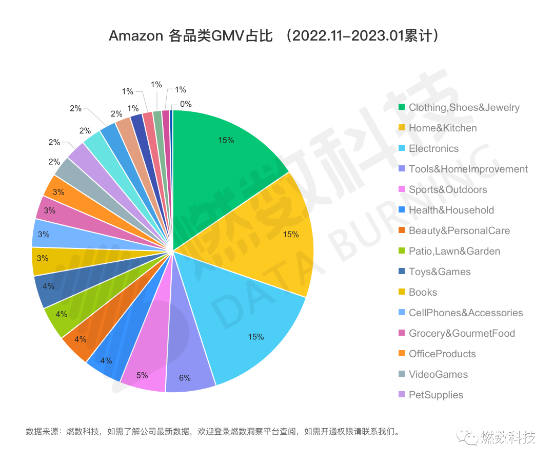 Temu前五大品类合计占比约3/4。该5个品类在Amazon的占比在Temu推出前后整体相对稳定,其中仅纺服珠宝的占比从22年7-9月的~16%略下降至23年1月的15%。