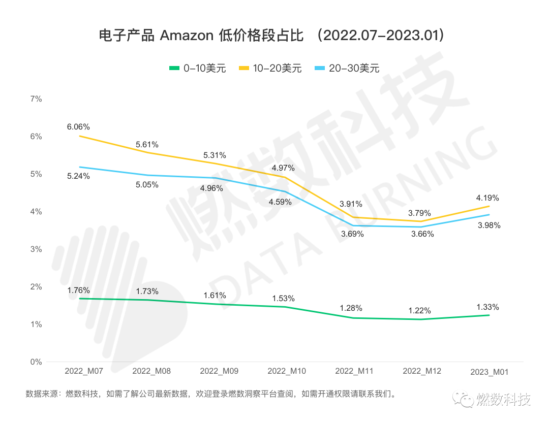 Temu推出后,Amazon低价电子产品占比降低:2022年7-9月,Amazon平台电子30美元以下产品的占比平均为12%;Temu平台推出后的22年11月-23年1月,Amazon30美元以下产品的占比分别平均为9%,相较22年7-9月略有下降。从绝对规模上来看,Amazon 30美元以下的电子产品(尽管占比只有9%)GMV仍远大于Temu的电子产品,因此Temu可能是Amazon低价电子产品占比下降的原因之一,但影响有限。