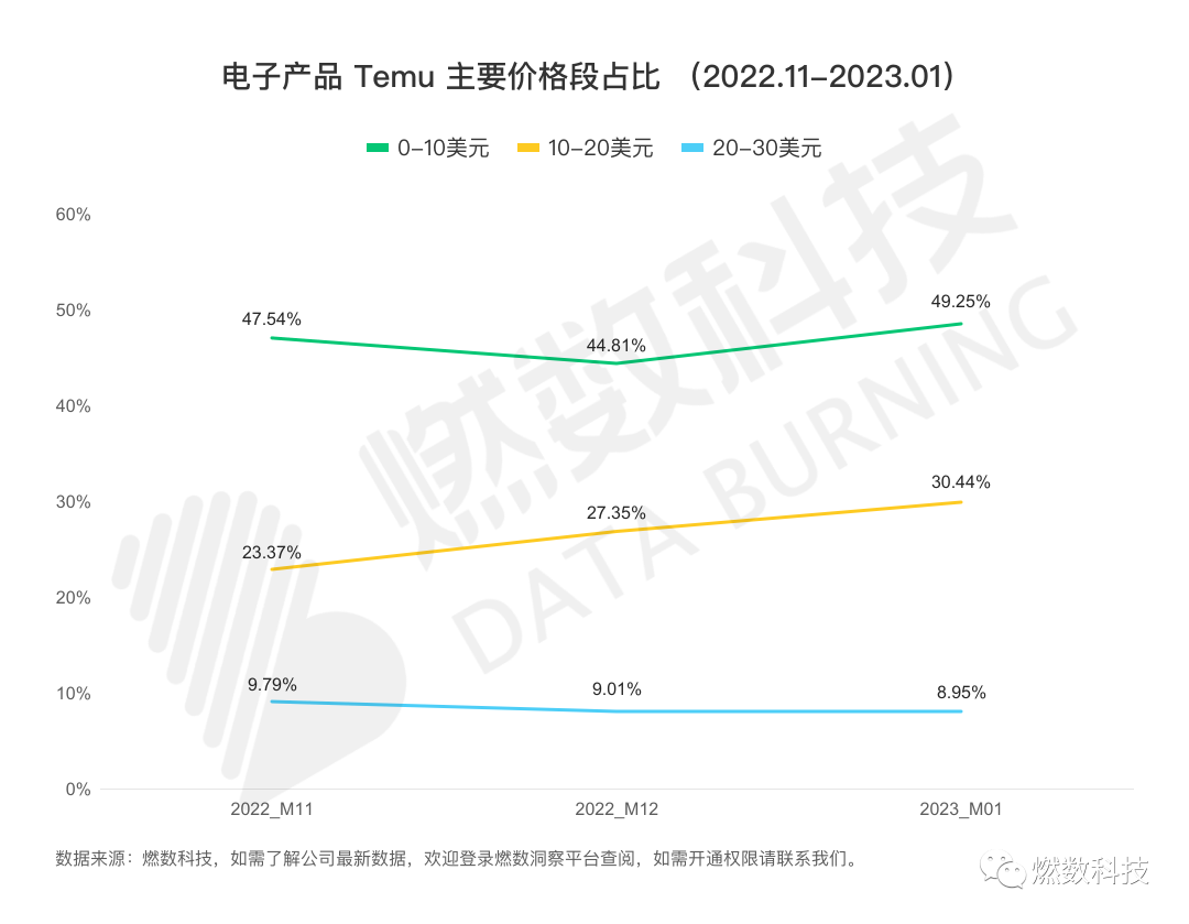 Temu平台家居厨房用品均价~4美元:从2022年11月至2023年1月,Temu平台家居厨房用品的均价~4美元,而Amazon平台~44美元。分价格段来看,Temu平台20美元以下产品的占比~85%,而Amazon 20美元以下产品的占比为~12%。