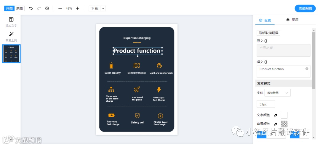万万没想到现在的技术如此厉害,已经不用美工动手,软件一键可以直接将翻译好的文字覆盖在原来的文字之上,下载图片就行。如下图所示: