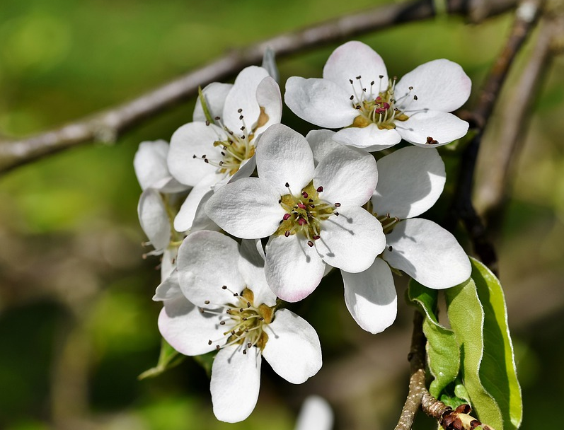 梨花特点:白!纯粹的白!叶子大!容易和李花搞混。梨花2-3朵一簇,大叶子相配,香气浓烈,树干有粗皮,花蕊有一点点红。