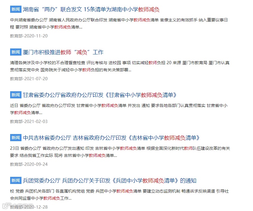 2019年,中共中央办公厅、国务院办公厅印发《关于减轻中小学教师负担进一步营造教育教学良好环境的若干意见》。2020年,全国31个省(区、市)和新疆生产建设兵团按照文件精神,分别出台了各省份中小学教师减负清单,建立健全教师减负体制机制,明确具体措施举措。