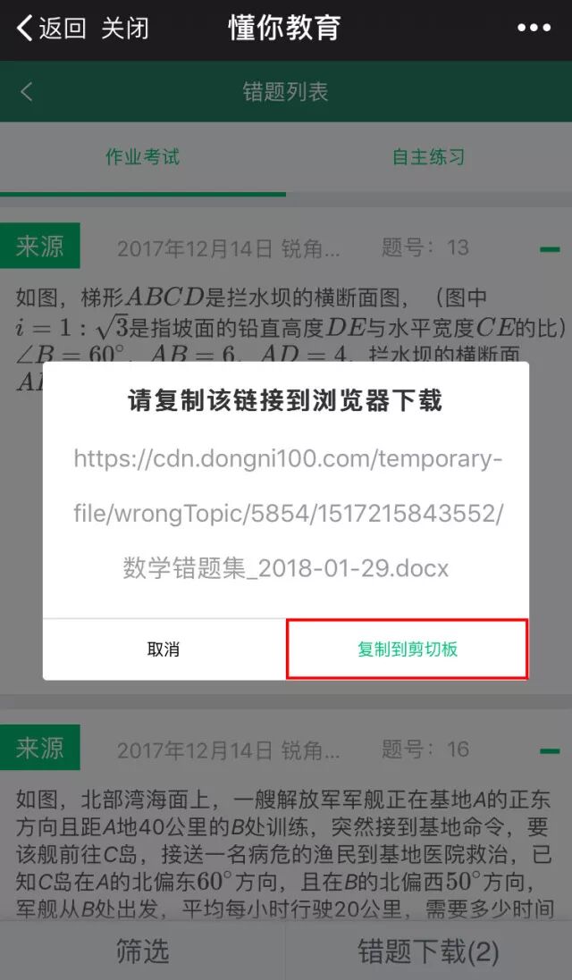 3.①根据需求勾选解析答案跟原作答,点击确定;②点击“复制到剪切板",把链接发给打印店可直接打印下来。