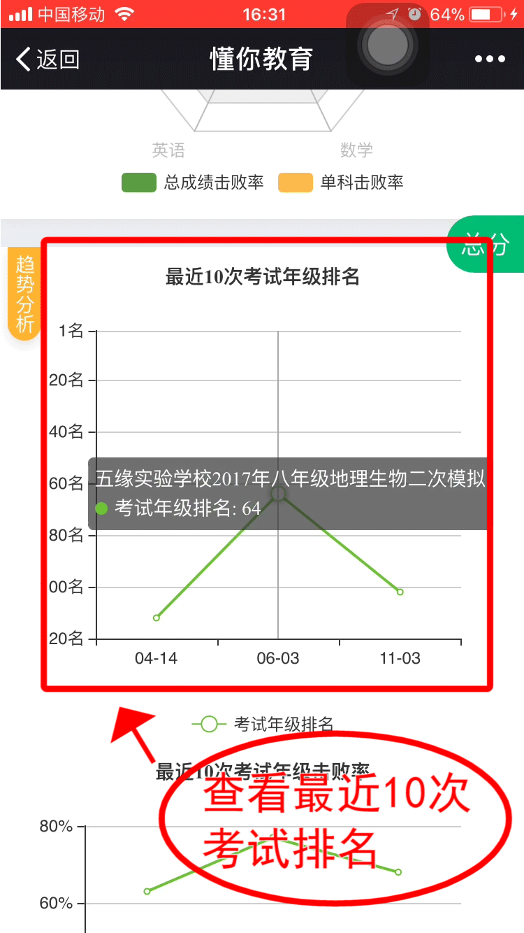 >在高级报告里查看近十次考试的年级排名、年级击败率、得分率