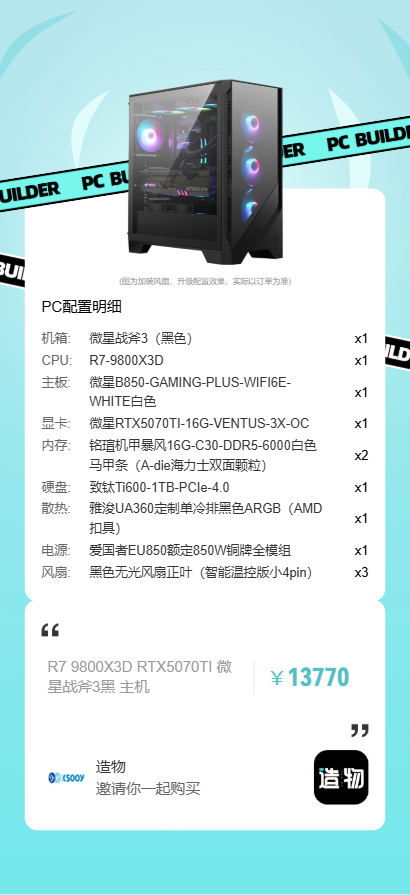 这套配置在13770元价位展现了精准的平衡性:R7 9800X3D与RTX 5070 Ti形成‘高缓存CPU+新一代显卡’的黄金组合,微星B850主板供电扎实,整机游戏性能约比同价位i5+RTX 4070 Super配置强15%-20%。建议后续可增加2TB机械硬盘作为存储补充,内存也可尝试超频至6400MHz CL30进一步释放AM5平台潜力。总体而言,这是一套面向未来3 - 5年游戏需求的高性价比方案,值得肯定!