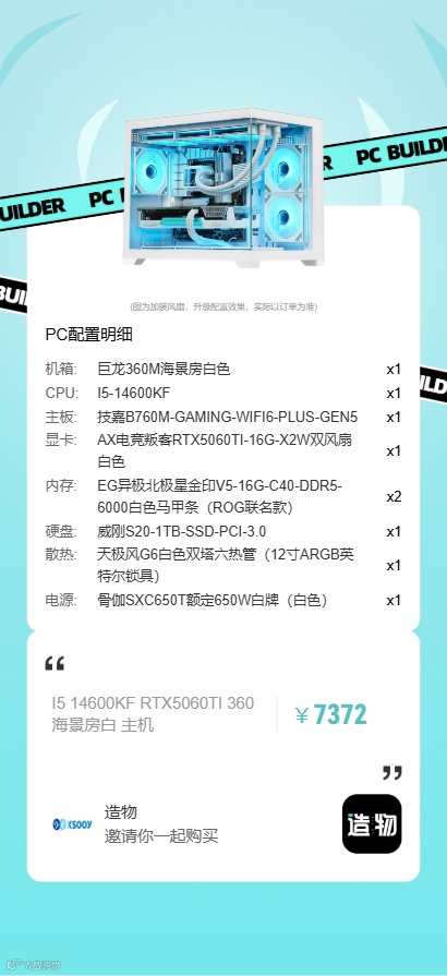 这套配置总体均衡,以7372元价格提供了优秀的游戏和生产力性能,白色主题外观统一。主要优势在于CPU与显卡的强力组合,适合2K高画质游戏和轻度创作。但部分配件如主板供电、内存时序和硬盘协议有优化空间,若小幅调整(如升级主板、内存和SSD),可进一步提升稳定性和响应速度。当前方案已物有所值,若用户注重长期使用体验,建议参考上述优化;若预算固定,现有配置仍值得购买,能满足多数中高端需求。
