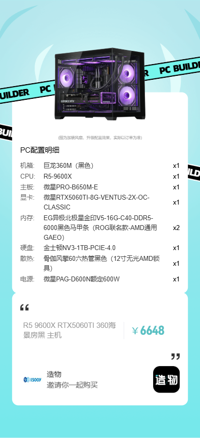 这套R5 9600X RTX5060Ti主机以6648元的价格,提供了均衡的中高端游戏性能。亮点在于新一代CPU和显卡的能效优势,以及DDR5内存和PCIe 4.0 SSD的快速响应。配置在1080p游戏和日常应用中表现流畅,散热和扩展性设计周到。尽管部分配件(如内存时序和电源认证)有提升余地,但整体性价比值得肯定,非常适合追求稳定游戏体验的用户。如果您注重长期使用,这套配置是明智之选,无需大幅调整即可满足多数需求。