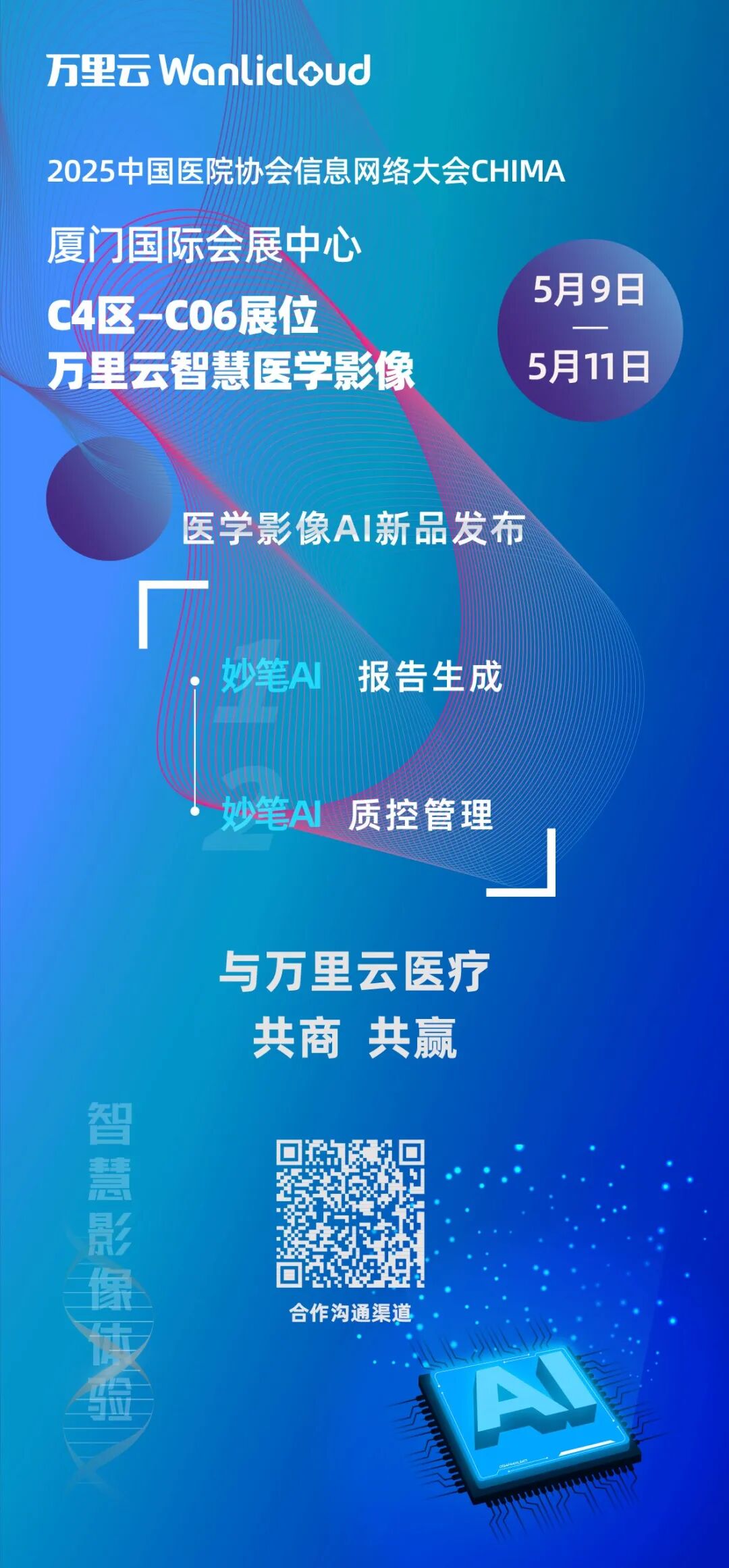 值此契机,万里云医疗诚邀全国医疗卫生机构、专家学者莅临展位(C4区-C06展位),共探影像AI质控和报告生成新范式,携手推进医疗信息化高质量发展!