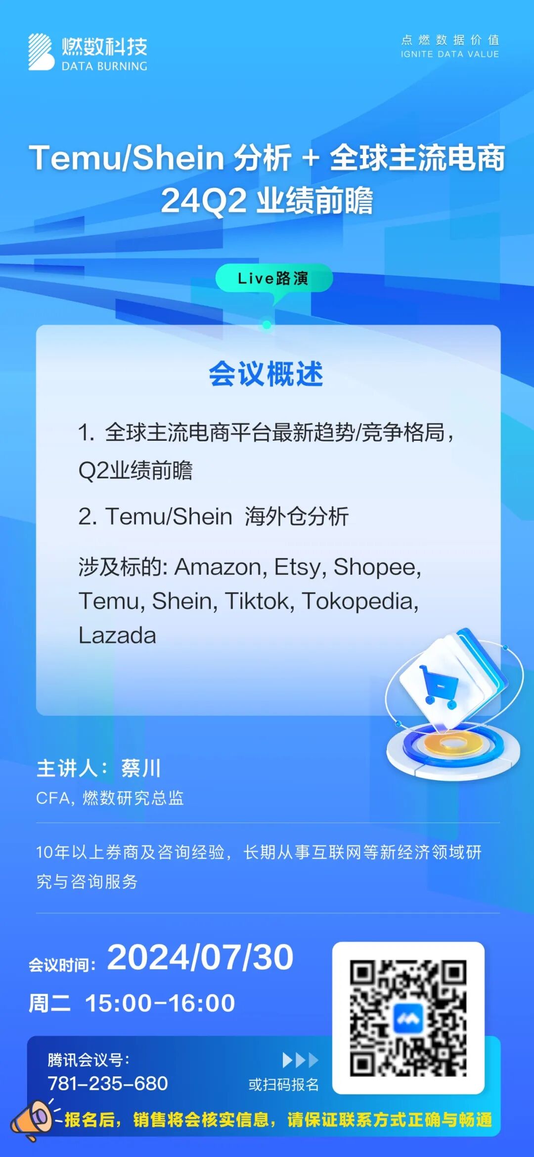 届时,燃数研究总监:蔡川,将于7月30日15:00在腾讯会议为大家带来线上直播,主题为:“Temu/Shein 分析 + 全球主流电商24Q2 业绩前瞻” 。具体报名方式请扫描下方海报二维码。