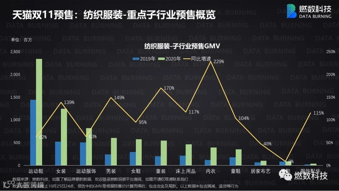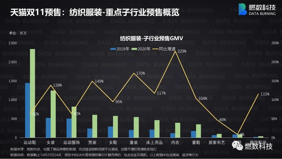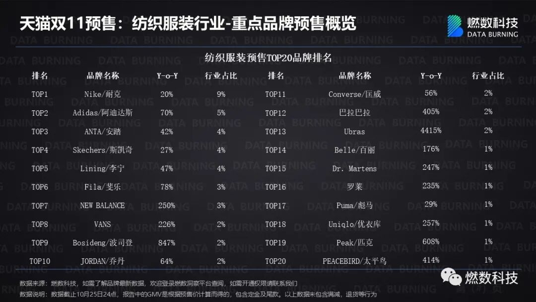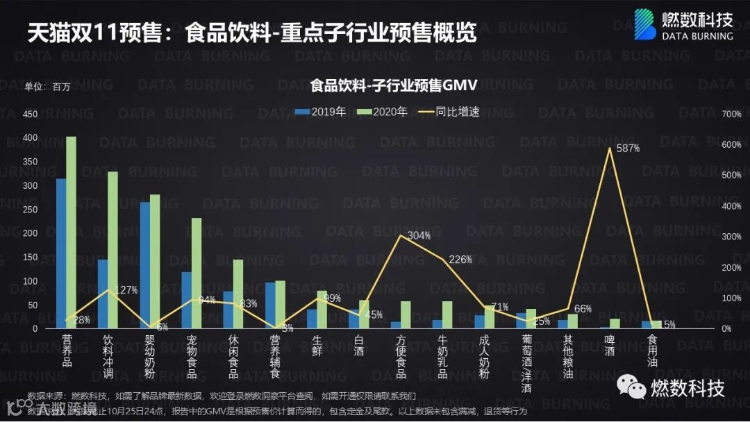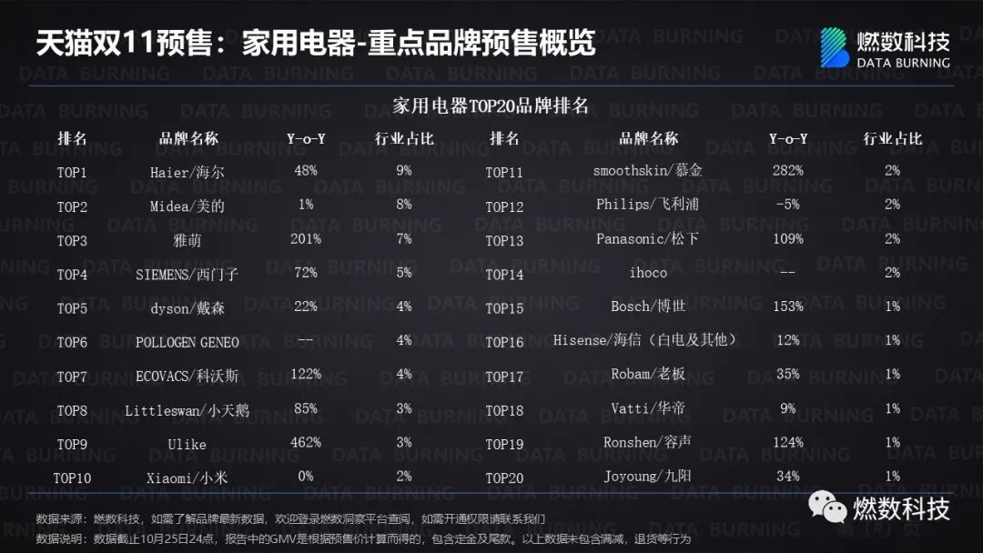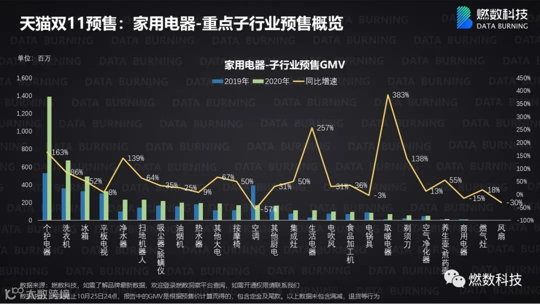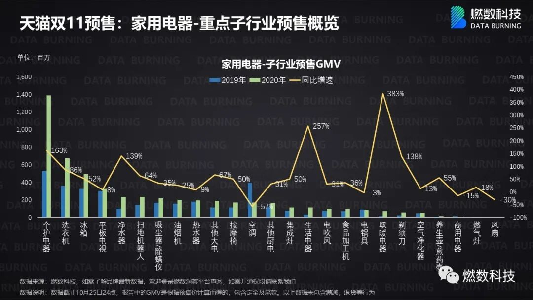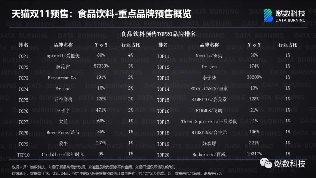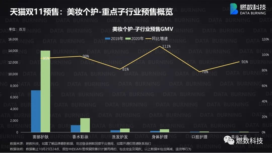 基于燃数科技的大数据建模,截止10月25日24时:天猫预售商品GMV与去年预售同期相比,同比增长80%。