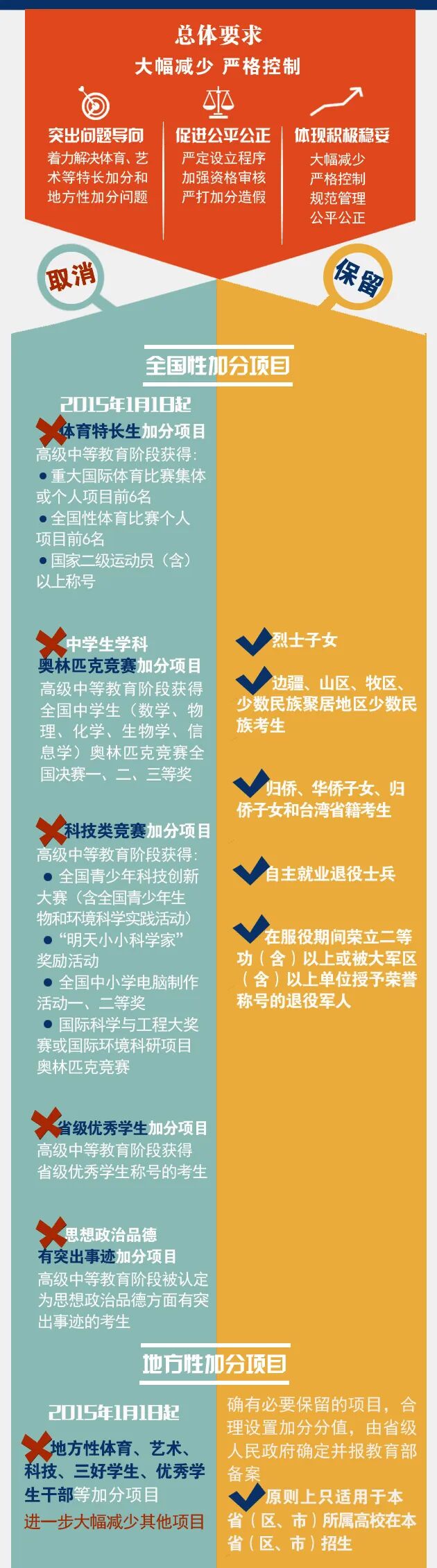 明确取消体育特长生、中学生奥林匹克竞赛、科技类竞赛、省级优秀学生、思想品德有突出事迹等五类全国性高考加分项目,指导各地减少地方性加分项目,进一步降低加分分值。