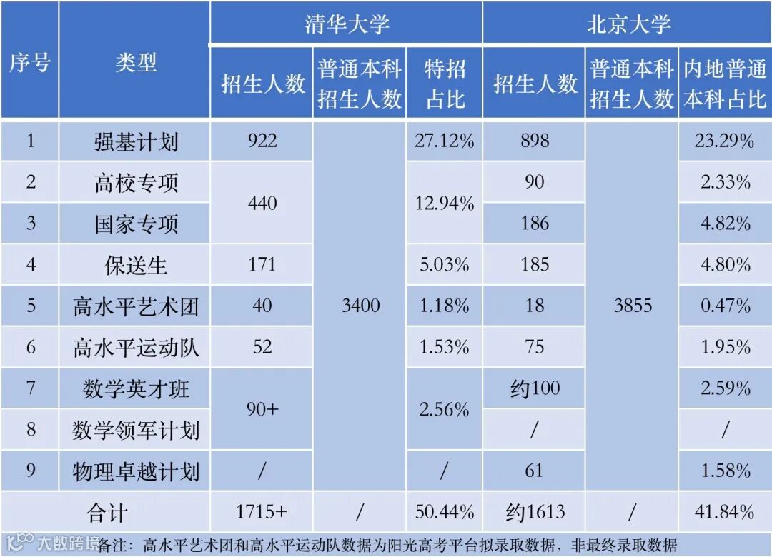 清华、北大两校2022年强基计划、高校专项计划、保送生等部分特殊招生招生途径录取数据如下: