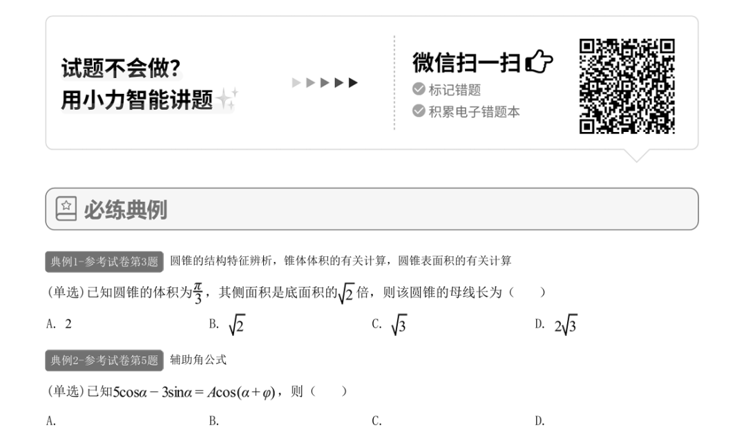 本次更新,我们在个册(单次本)上配备二维码入口。家长/学生通过【微信】或者【小力学伴】扫一扫功能扫描文档上的二维码,即可线上查看学生校内试题详情,题目内容、解析一目了然,每道错题都配备讲解入口,操作便捷,方便学生随时学习。
