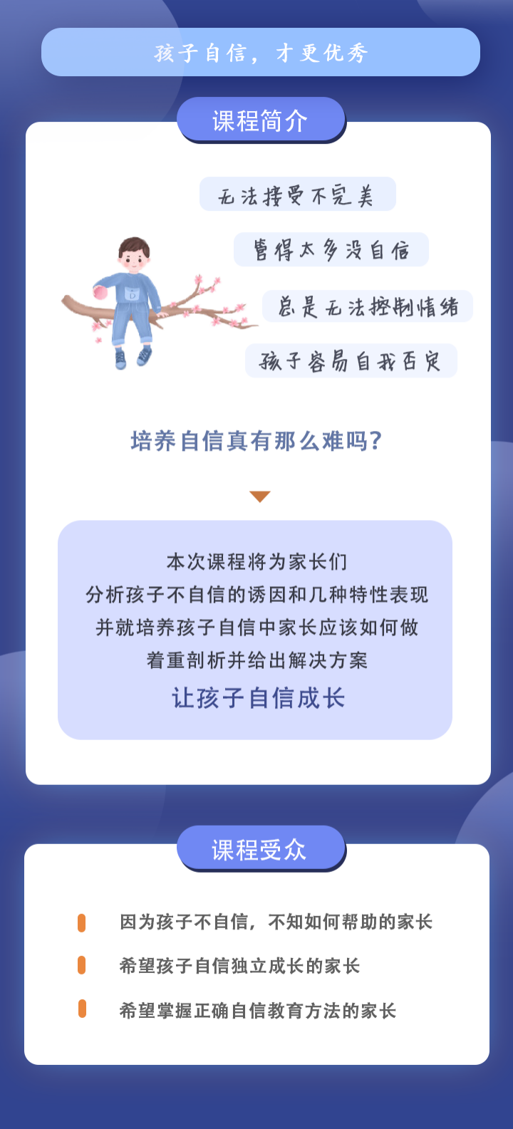 家长只有引导孩子接纳不完美,掌握正确的帮助建立孩子自信的办法,才能让孩子不管在日常生活还是学习中逐渐控制自我,培养自信。这些建议和具体方法都能在本次家长锦囊的课程中找到答案。